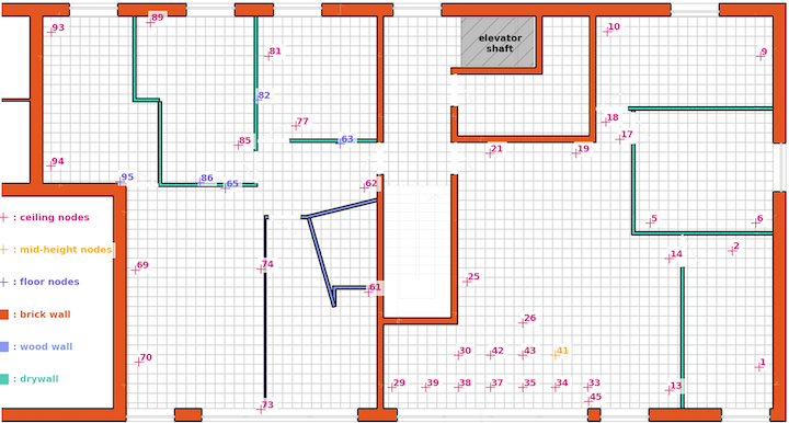 该测试平台主要分布于两个地点:一处是科研设施;另一处是位于布兰尼亚克的“智能家居”研究环境。在科研楼内,UWB节点被部署在开放空间,甚至被安装在电波暗室内,来模拟无线电隔离条件。一些节点安装在滑轨上,以实现可控移动;近期更引入了机器人移动平台,进一步提升实验复杂度。