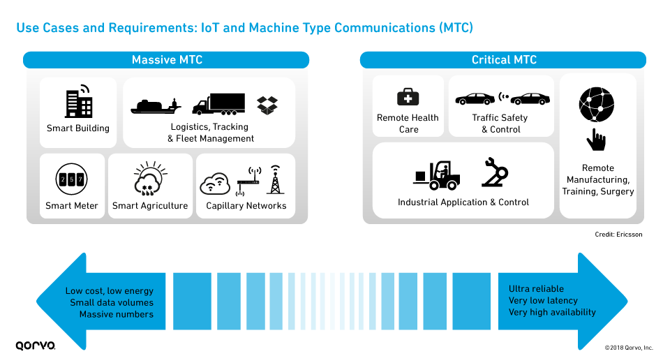 下图显示了大规模 MTC 和关键 MTC 应用支持的一些物联网用例。大规模 MTC 依赖于 LPWAN 技术,包括 NB‑IoT 和 LTE‑M,而关键 MTC 则需要具备极低延迟和较高可靠性的实时通信。