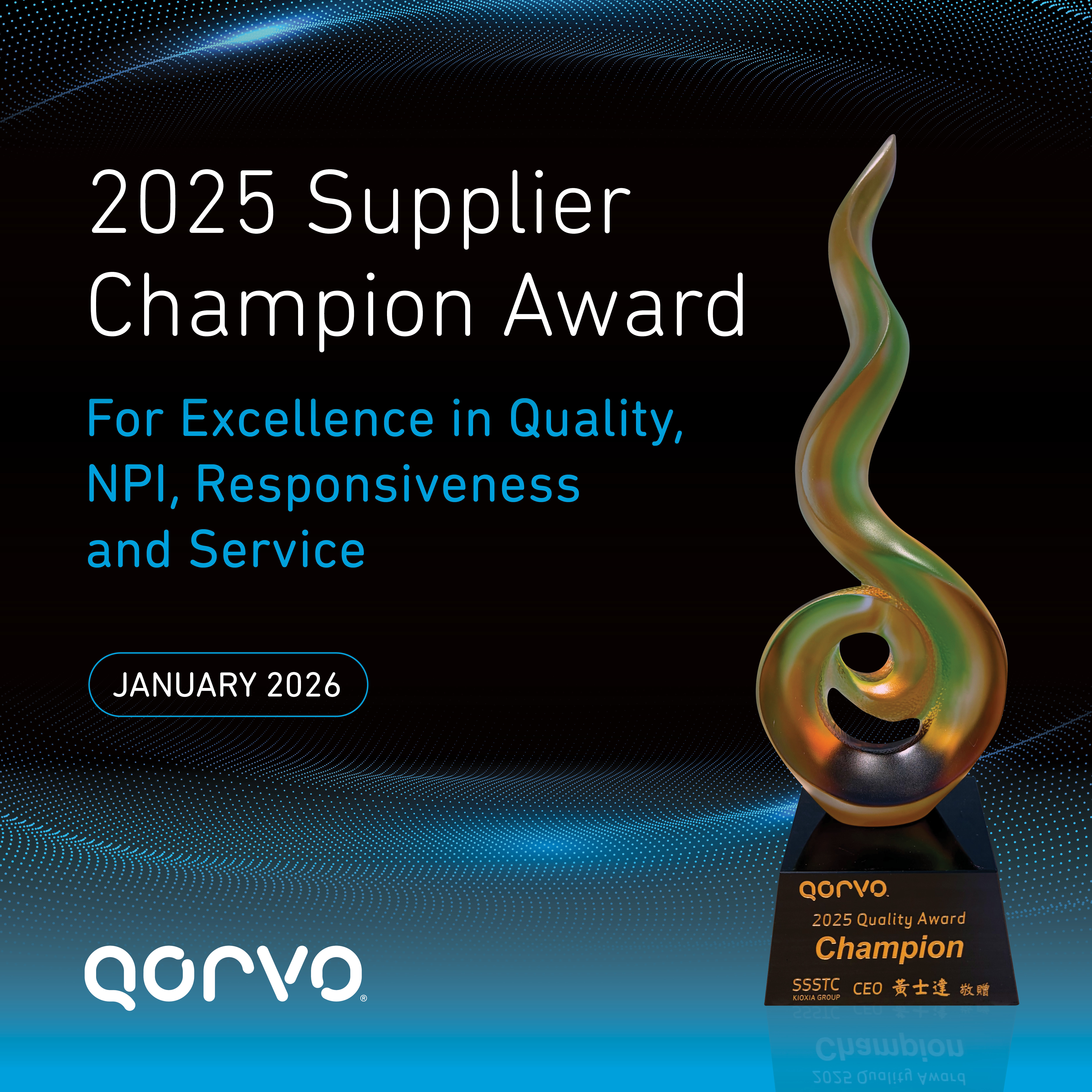 美国北卡罗来纳州格林斯巴勒 – 2026 年 3 月 3 日 – 全球领先的连接和电源解决方案供应商 Qorvo®(纳斯达克代码:QRVO)宣布荣获建兴储存科技公司(SSSTC)颁发的“电源类供应商冠军奖”。该奖项每年授予在SSSTC质量评估中表现最为出色的供应商。